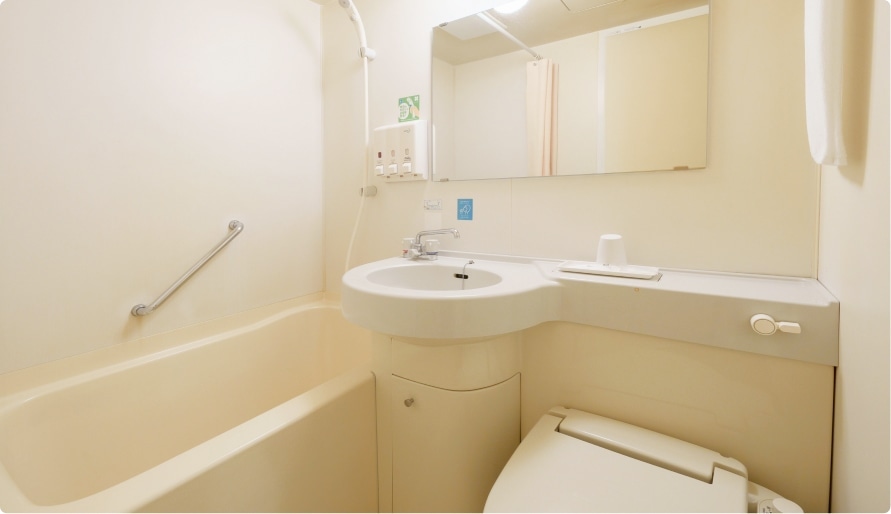 (ユニットバスを含む)定員 1名 ベッド W120cm × D200cm 設備 セミダブルベッド/テレビ/簡易冷蔵庫/シャワートイレ -